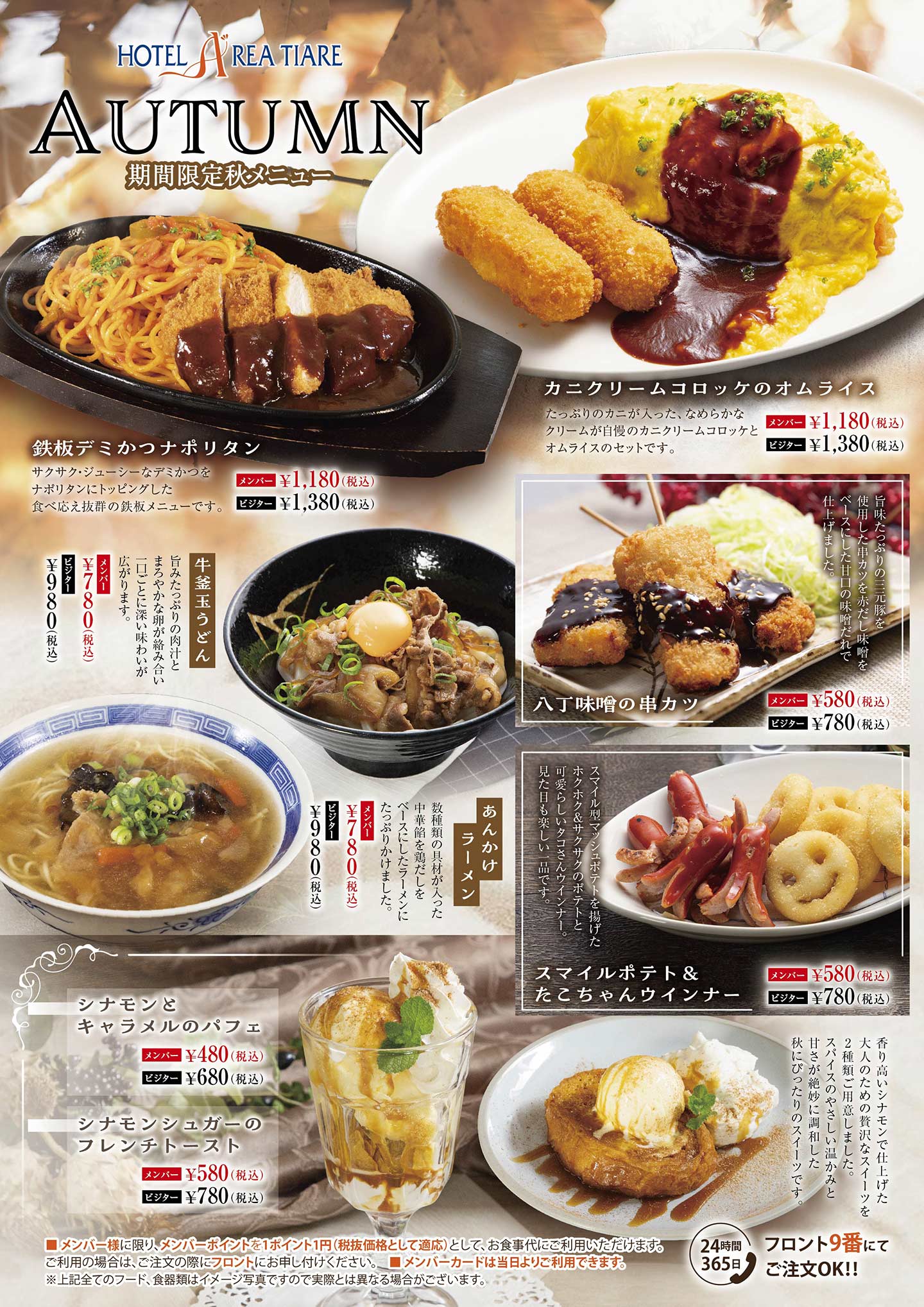 秋の期間限定メニュー ・カニクリームコロッケのオムライス ・鉄板デミかつナポリタン ・牛釜玉うどん ・あんかけラーメン ・八丁味噌の串カツ ・スマイルポテト&たこちゃんウインナー ・シナモンとキャラメルのパフェ ・シナモンシュガーのフレンチトースト ※グランドメニュー半額デー期間中、こちらのメニューは対象外となります。 ※フロント(9番)にて24時間ご注文お受けいたします。