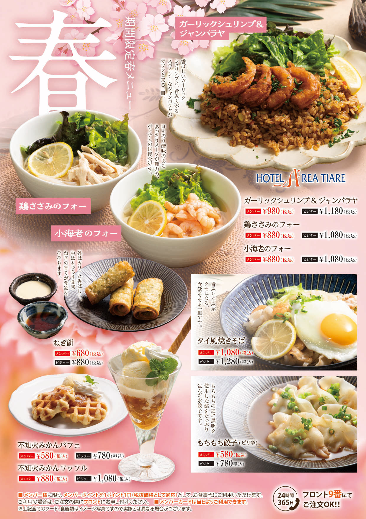 春の期間限定メニュー ・ガーリックシュリンプ& ジャンバラヤ ・鶏ささみのフォー ・小海老のフォー ・ねぎ餅 ・タイ風焼きそば ・もちもち餃子(ピリ辛) ・不知火みかんパフェ ・不知火みかんワッフル ※グランドメニュー半額デー期間中、こちらのメニューは対象外となります。 ※フロント(9番)にて24時間ご注文お受けいたします。